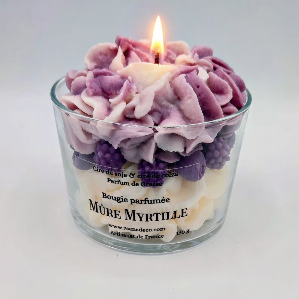 La bougie gourmande au parfum mûre myrtille est confectionnée à la main, dans le sud de la France à quelques kilomètres de nos parfumeurs.